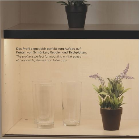Profil LED din aluminiu alb RAL9010, grosime 19 mm, special conceput pentru montaj pe marginea rafturilor din mobilier.